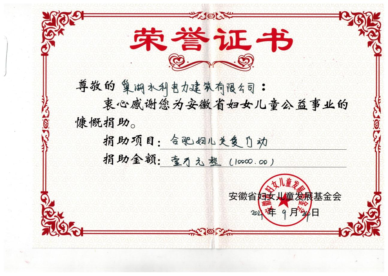 為大力弘揚中華民族“樂善好施 扶弱濟困”傳統美德,凝聚社會力量,搭建公益平臺,合肥市婦聯聯合安徽省婦女兒童發展基金會在2021年9月7日——9月9日期間,發起2021年“99公益日”合肥市婦兒關愛行動,廣泛宣傳發動社會各界愛心單位和愛心人士,積極參與籌集愛心善款,開展公益捐贈活動,以實際行動幫助更多困難婦女兒童及其家庭。我公司向安徽省婦女兒童發展基金會捐款壹萬元整。