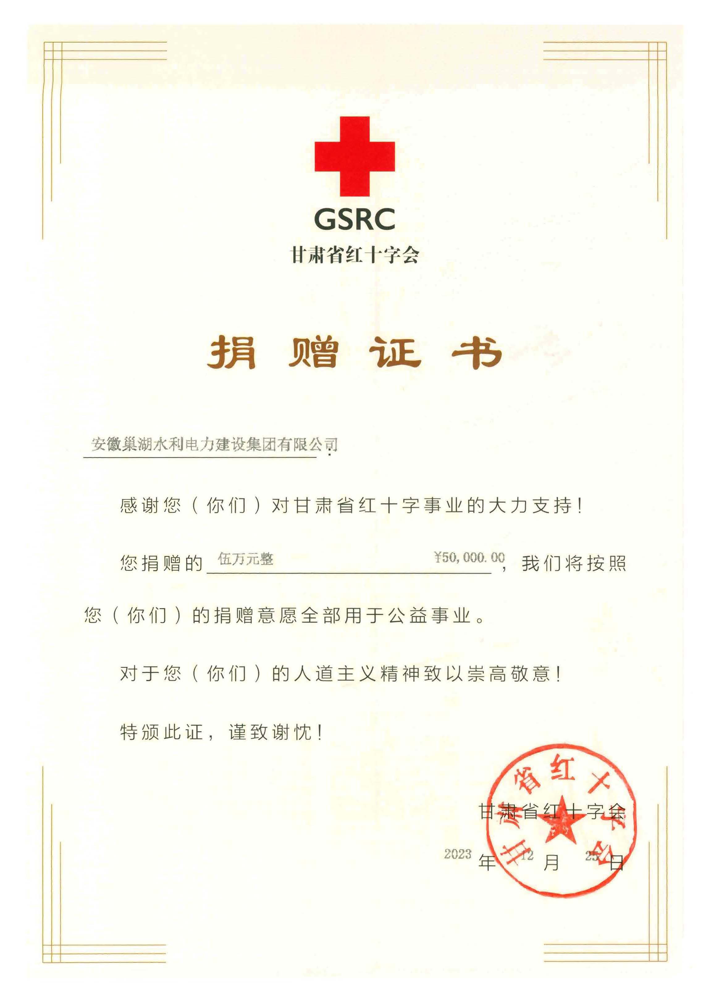 為支持災(zāi)區(qū)人民抗震救災(zāi),安徽巢湖水利電力建設(shè)集團(tuán)有限公司第一時間發(fā)出倡議書,號召廣大黨員干部、職工積極捐款,充分履行企業(yè)責(zé)任擔(dān)當(dāng)。12月22日上午,安徽巢湖水利電力建設(shè)集團(tuán)有限公司舉行向甘肅地震災(zāi)區(qū)捐款活動,公司領(lǐng)導(dǎo)帶領(lǐng)全體員工積極參加捐款,大家同心協(xié)力、眾志成城,將愛心奉獻(xiàn)給災(zāi)區(qū)人民。在此次活動中,公司和黨支部分別捐款5萬元和1萬元,捐款將通過甘肅省紅十字會及時送到交區(qū)人民手中,幫助災(zāi)區(qū)人民共渡難關(guān)。12月25 日公司收到了來自甘肅省紅十字會分別向公司和公司黨支部發(fā)來2本捐贈證書。千言萬語繪制成一紙證書,記錄安徽巢湖水利電力建設(shè)集團(tuán)有限公司全體員工與受災(zāi)群眾風(fēng)雨同舟、團(tuán)結(jié)一心、共克災(zāi)情。希望我們每個人的微小之力,積水成淵,用我們的愛心溫暖了這個冬天。