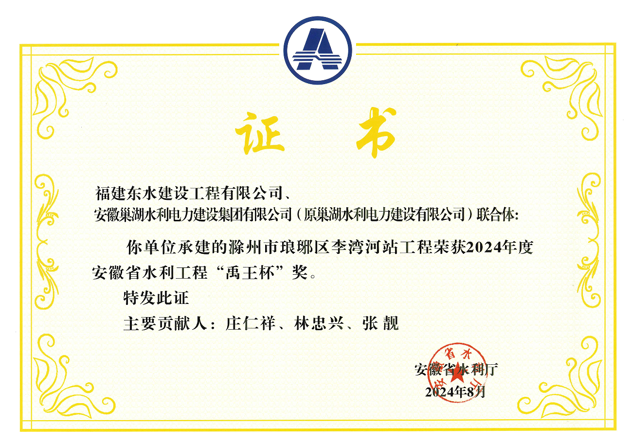 滁州市瑯琊區(qū)李灣河站工程榮獲“禹王杯”榮譽(yù)證書