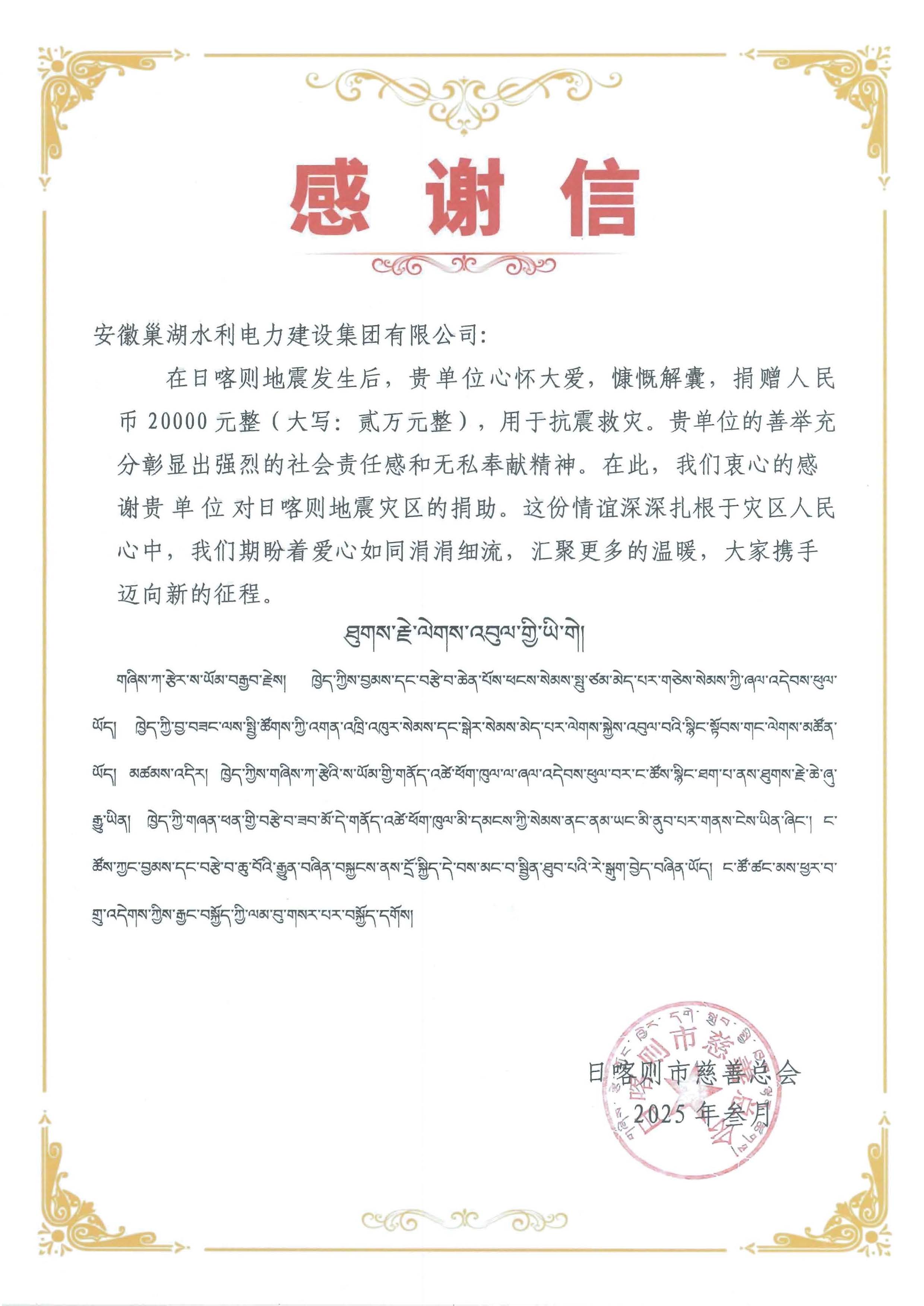 安徽巢湖水利電力建設集團有限公司為支援西藏日喀則地區(qū)抗震救災工作,積極履行企業(yè)社會責任,我司向此次地震災區(qū)捐贈人民幣貳萬元,用于受災群眾生活保障、災后重建及相關救援工作。